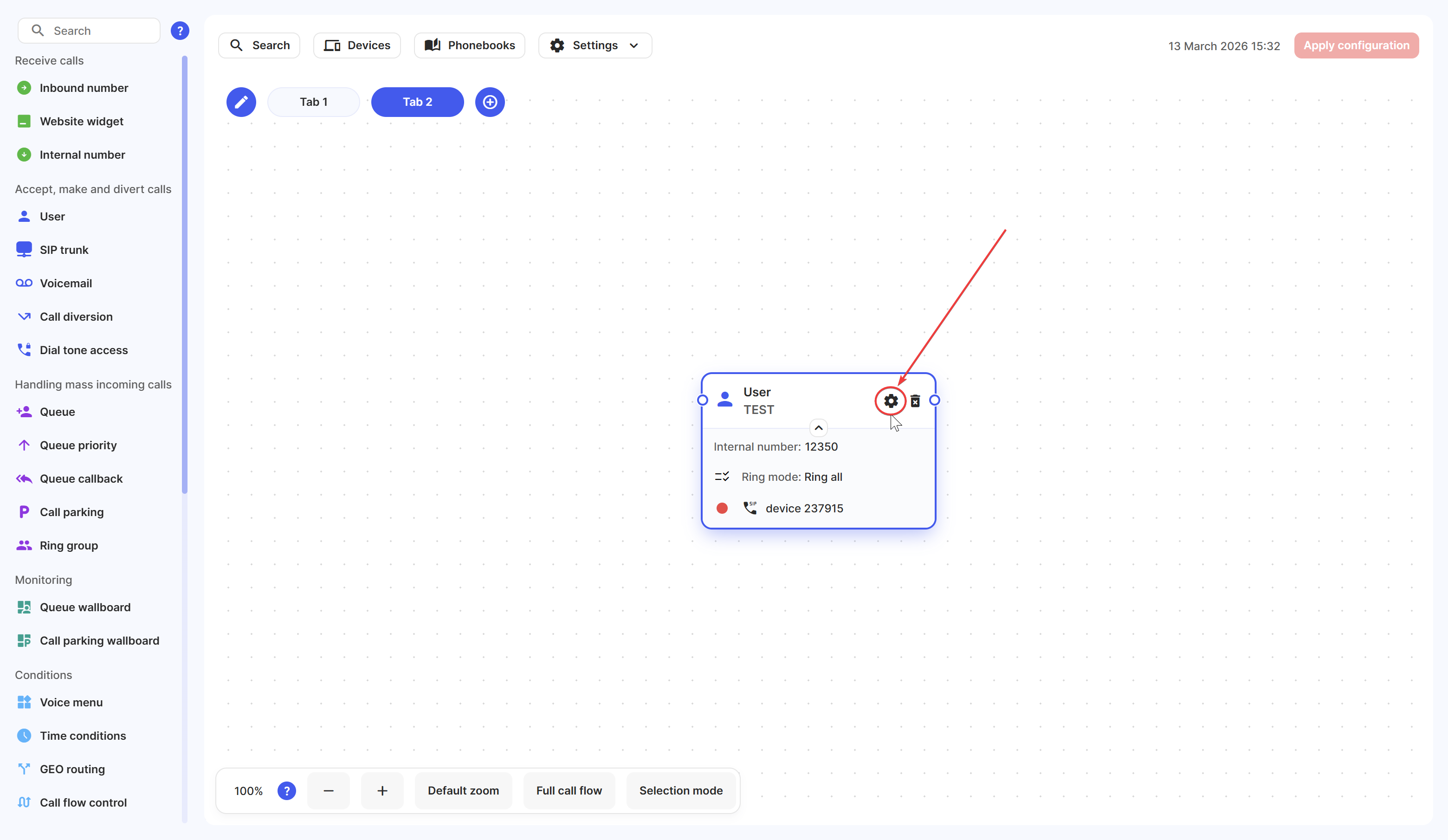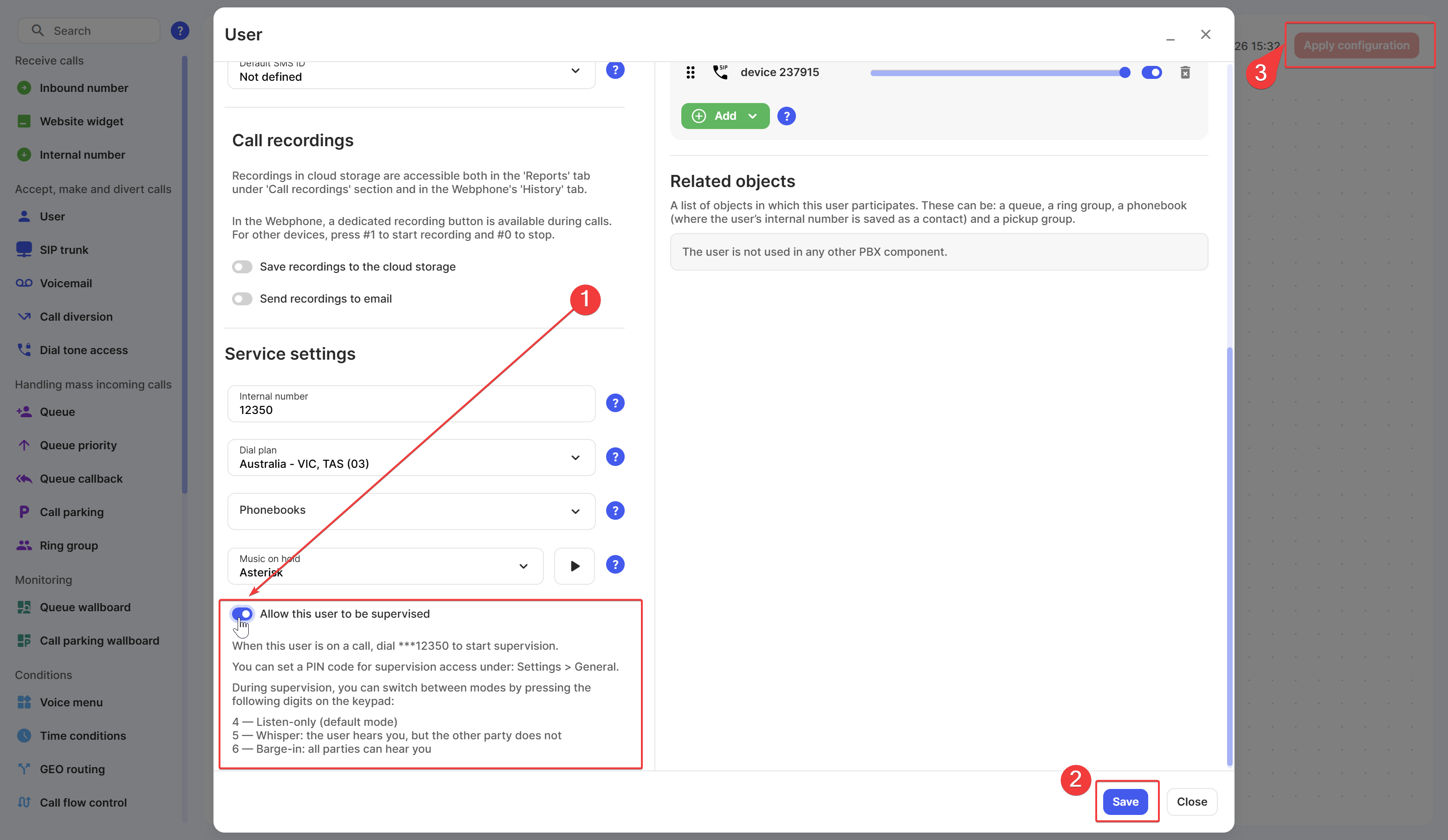 To monitor calls in real-time, first, enable the call supervision option found in the user object settings. Select the user(s) you wish to monitor and supervise, see User & Device Management for details on how to order and configure this within your call flow.