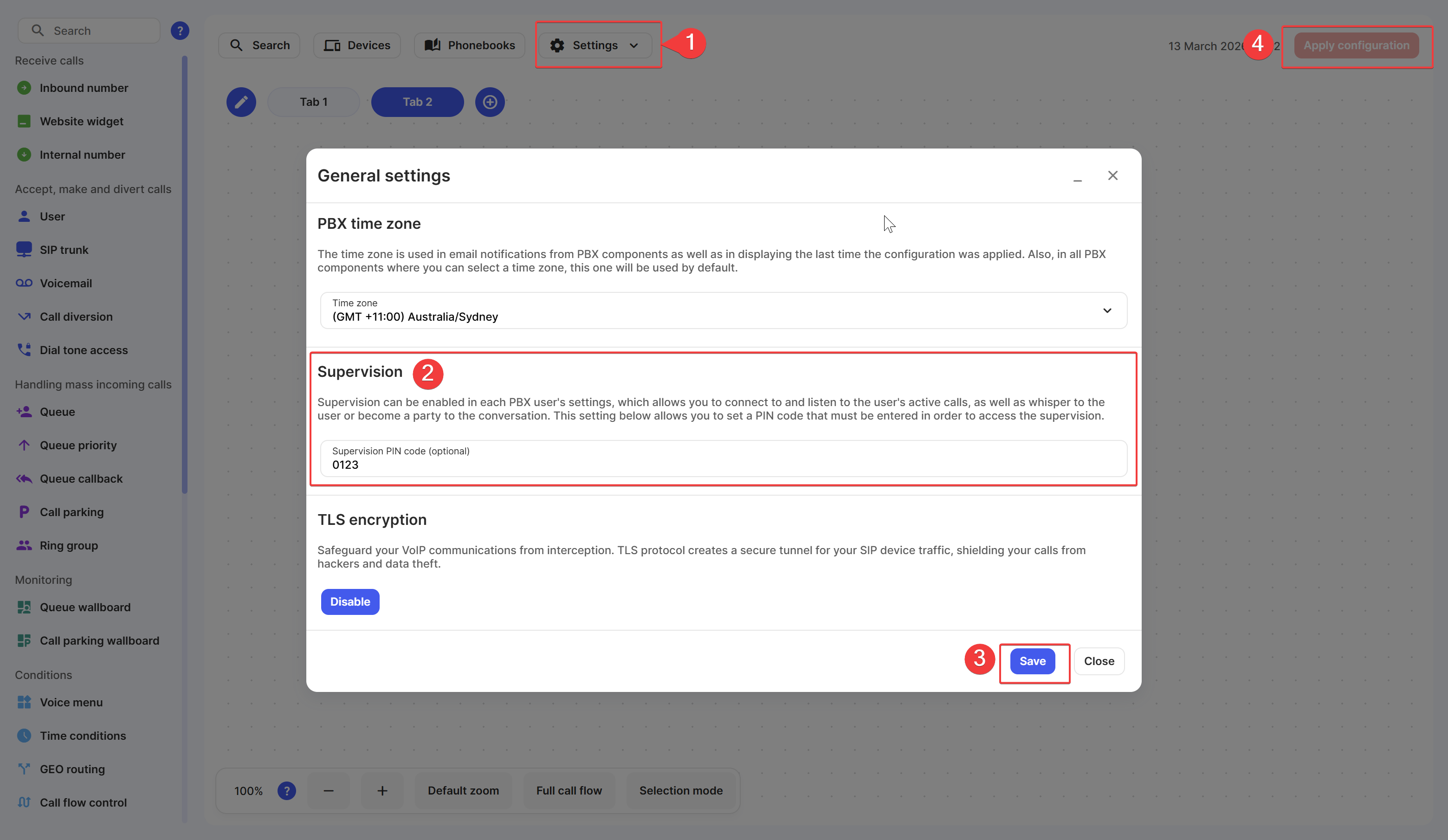 We highly recommend configuring a PIN code which will need to be entered shortly after dialling the call supervision feature access code. On the left-hand corner of the toolbox menu, click on Settings and a new window will populate. Click on the Preferences tab and enter the 4 digit PIN code you wish to set. Then, press the green Update PIN-code button and click Apply Configuration to save these changes.